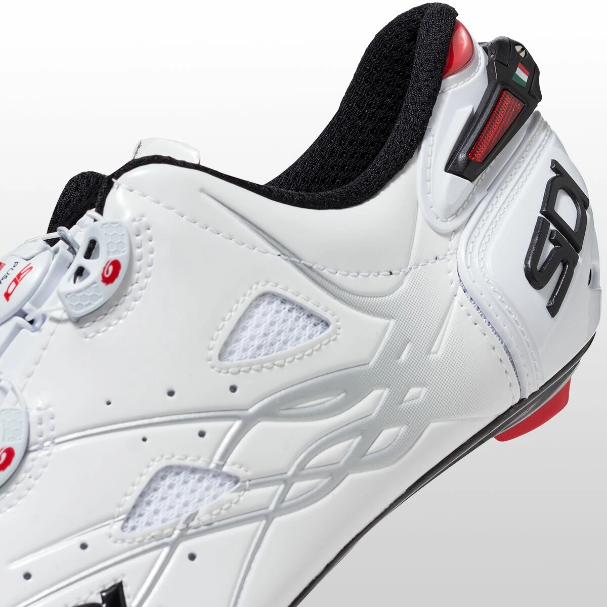 The Shot stands alone as the only shoe in Sidi’s line to embrace the symmetrical closure system of central dials rather than dials offset on the outside of the foot. The effect pulls the upper from both sides, enveloping the foot in a cocoon of Microfibra Techpro rather than pulling the material over the top from the instep. The closure system also makes the Shot Sidi’s cleanest shoe, both aesthetically and when it comes to aerodynamics. Fewer bulky protrusions make for a more minimalist silhouette than what we’re used to from Sidi, and less protrusion also means fewer transitional ridges to catch the air and slow you down.