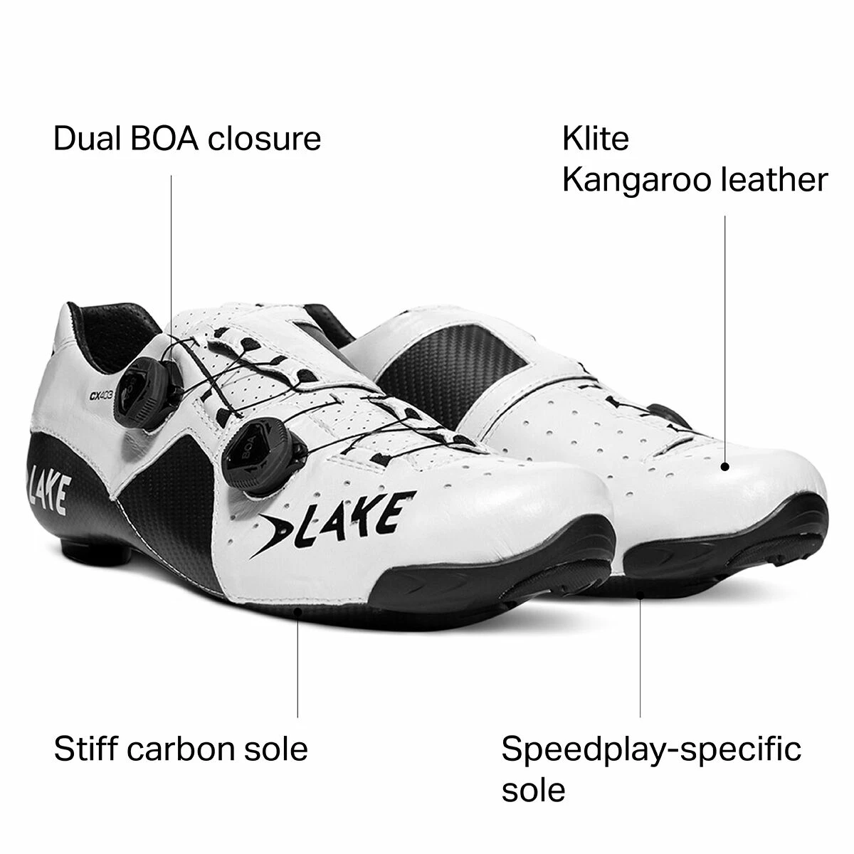 Lakeโs top-tier road shoe gets an update in the new CX403. Featuring the same custom fit carbon fiber sole and supple kangaroo leather upper as its predecessor, the CX403โs BOA closure system is redesigned and the added rubber toe bumper helps extend the shoeโs longevity. These CX403 Shoes are offered in a Speedplay-specific sole, eliminating the need for adapter base plates and lowering the stack height for improved power transfer.